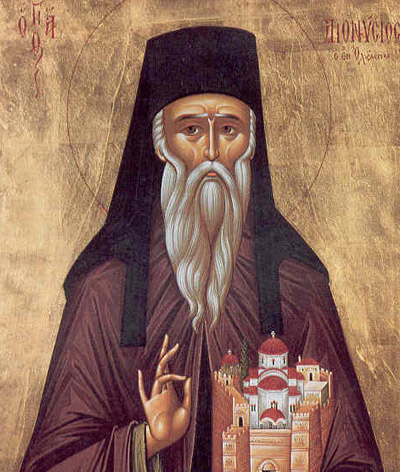 Νουνεχώς την άσκησην της εγκρατείας, συ εκτήσω χάριτι, ω Διονύσιε πολλή∙ διο Τριάς σε εδόξασε, πλουσίοις έργοις, ομού και θαύμασιν.